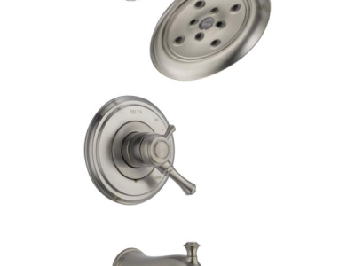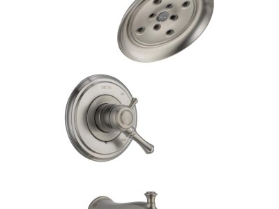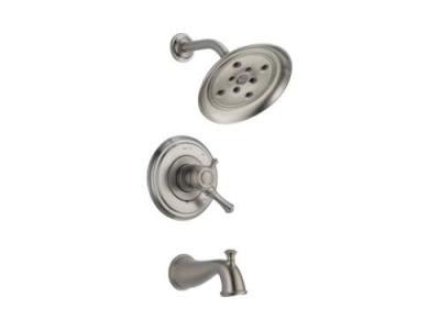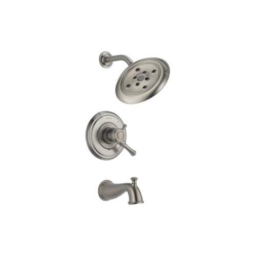 DELTA® Tub and Shower Trim, Series: Monitor® 17, Cassidy™ Collection, 1.75 gpm Shower Flow Rate, Pull-Up Diverter Spout, 6-1/2 in Spout Reach, 7-2/3 in Spout Height, 1 Handles, Metal Lever Handle, 7 in Dia Trim, 1222 Pressure Balanced, Hand Shower: No, Spray Pattern: H2Okinetic®, 1 Spray Functions, Wall Mounting, Solid Brass, Stainless Steel