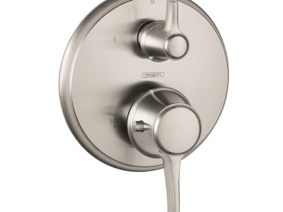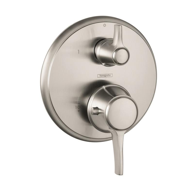 Hansgrohe Thermostatic Trim, Ecostat C, 2 Handles, Lever Handle, 6-3/4 in Dia x 2-5/8 to 3-3/4 in D Trim, Hand Shower Yes/No: No, 44 psi, 120 to 140 deg F, Wall Mount, Brass, Brushed Nickel
