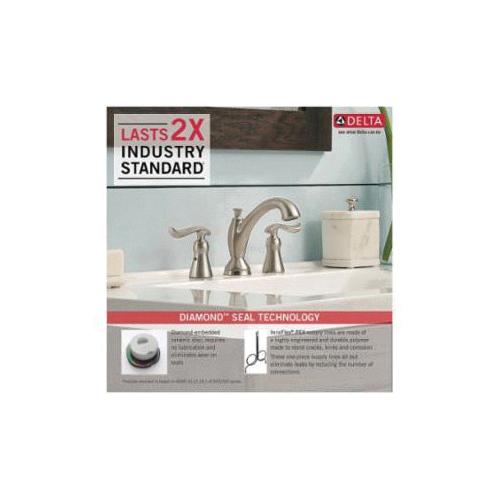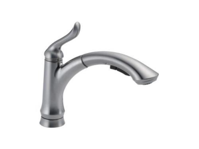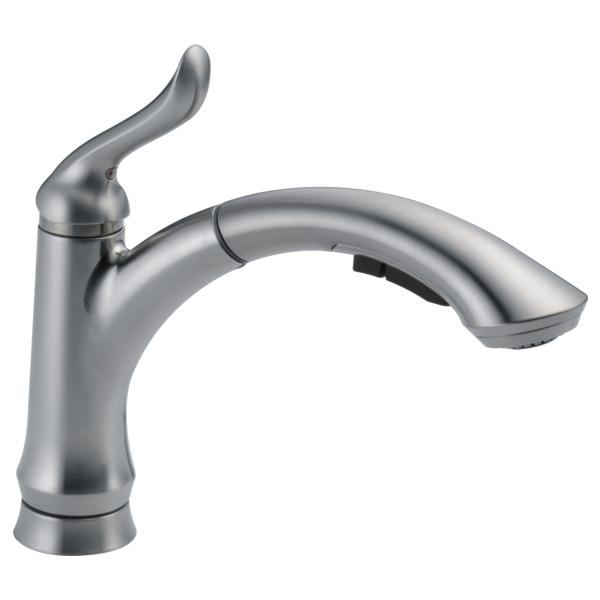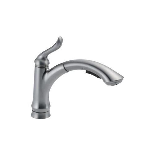 DELTA® Kitchen Faucet, Linden™ Collection, 1.5 gpm Flow Rate, 8 in Center Distance, 120 deg Swivel Spout, 9-57/64 in Spout Reach, 11-3/8 in Spout Height, 59 in Hose, Lever Handle, 1 Handles, Side Spray(Y/N): No, 1/3 Faucet Holes, 1-5/16 in Faucet Hole, 3/8 in Connection, Compression Connection, Spray Pattern: Aerated Stream/Full Body, 2 Spray Functions, 2-1/2 in Maximum Deck Thickness, Deck Mounting, Euro-Motion DIAMOND™ Seal Valve, Zinc, Arctic™ Stainless Steel, Domestic, Commercial Commercial/Residential