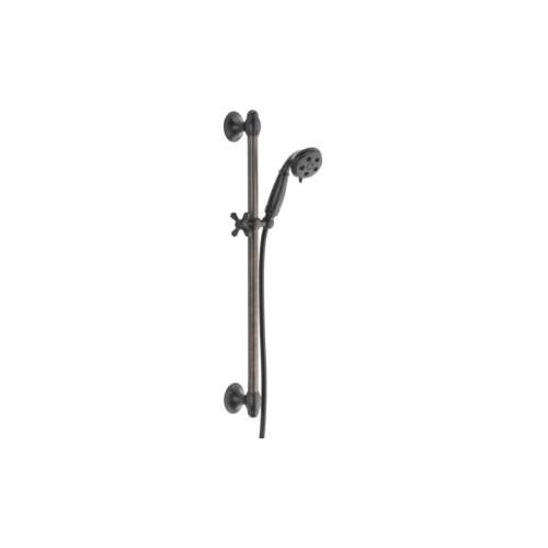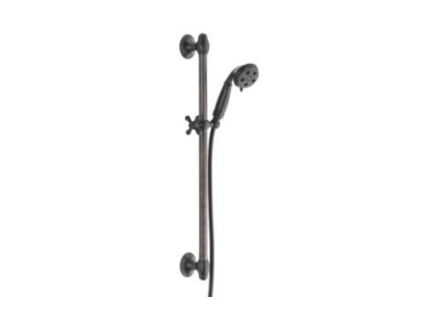 DELTA® Hand Shower, 3 in Shower Head Diameter, 3 Shower Head Patterns, 2 gpm Flow Rate, 60 to 82 in Hose Length, H2Okinetic®/Massage/Pause Spray, 80 psi Pressure, 1/2 in Connection, Metal Hose, Brass, Venetian Bronze, 3-5/16 in D x 9-5/16 in H Dimensions, With Slide Bar: Yes, Import