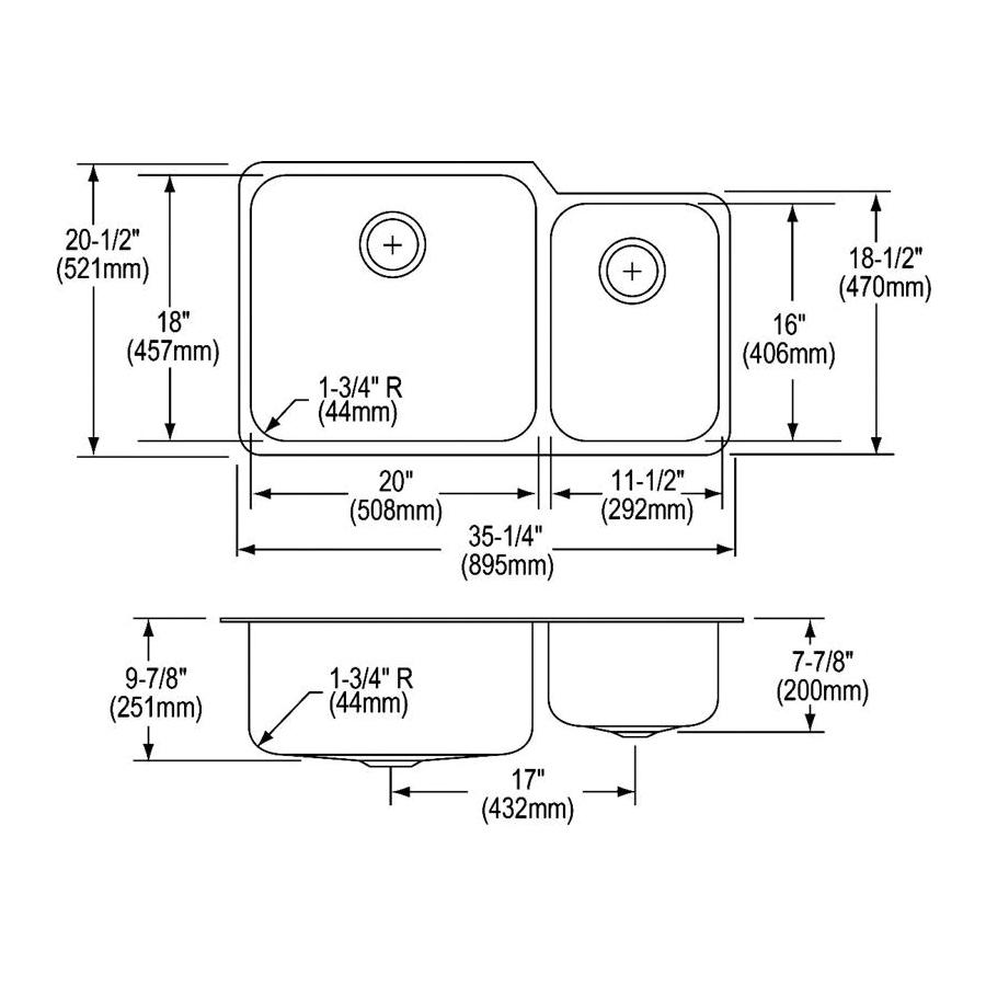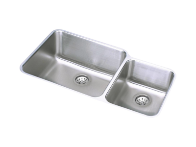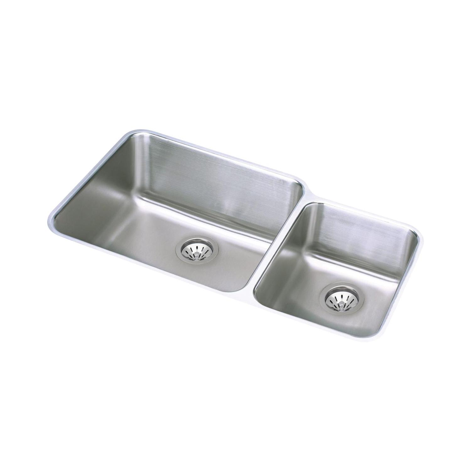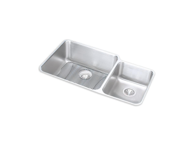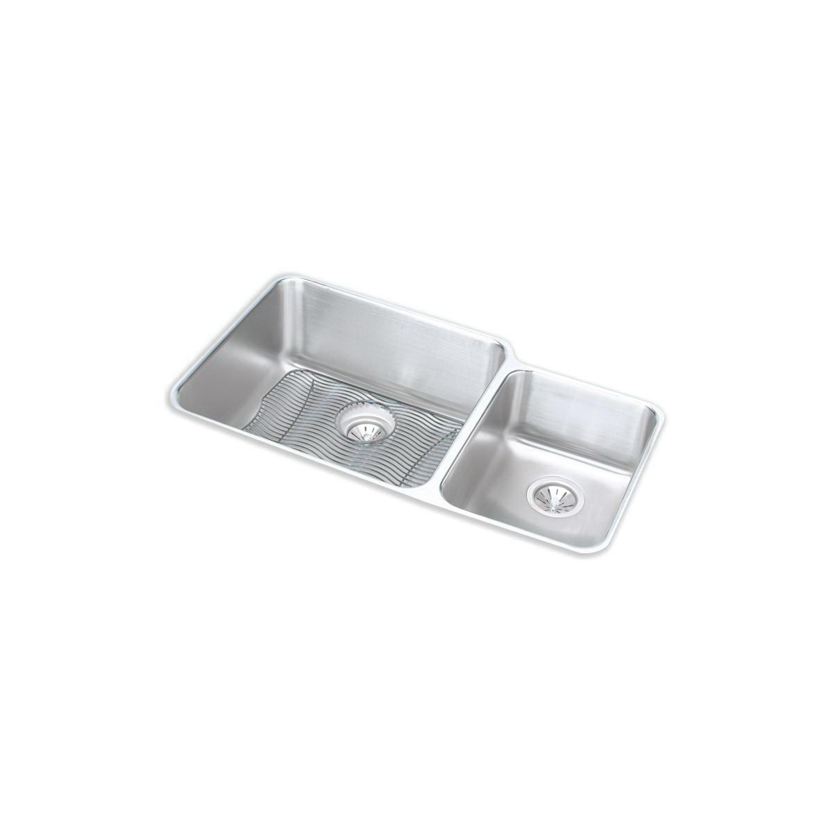 Elkay®, ELUH3520RDBG, Kitchen Sink Kit, Offset, Lustertone™ Classic Collection, Rectangle Shape, 20 in Left, 11-1/2 in Right Bowl Length, 18 in Left, 16 in Right Bowl Width, 9-7/8 in Left, 7-7/8 in Right Bowl Depth, 3-1/2 in Drain Opening, 2 Bowls, 35-1/4 in L x 20-1/2 in W x 9-7/8 in H Overall, Undermount Mounting, 18 ga 304 Stainless Steel