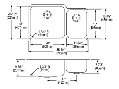 Elkay® ELUH3520RDBG Lustertone™ Classic Offset Kitchen Sink Kit, Rectangle Shape, 20 in Left, 11-1/2 in Right L x 18 in Left, 16 in Right W Bowl x 9-7/8 in Left, 7-7/8 in Right D Bowl, 35-1/4 in L x 20-1/2 in W x 9-7/8 in H, Undermount Mounting