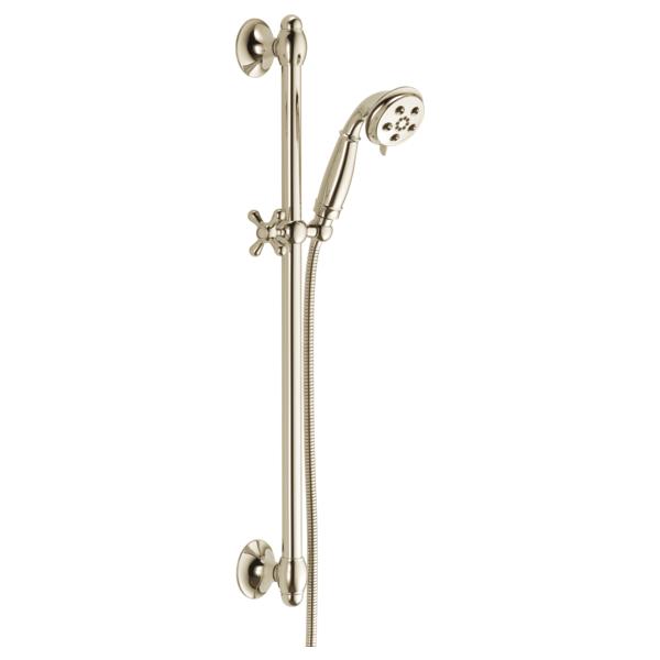 DELTA® Hand Shower, 3 in Shower Head Diameter, 3-Function Shower Head Patterns, 2 gpm Flow Rate, 60 to 82 in Hose Length, H2Okinetic®/Massage/Pause Spray, 80 psi Pressure, 1/2 in Connection, Metal Hose, Brass, Polished Nickel, 3-5/16 in D x 9-5/16 in H Dimensions, With Slide Bar: Yes, Import