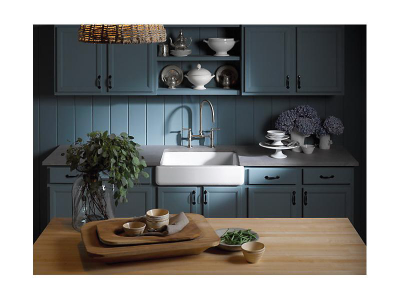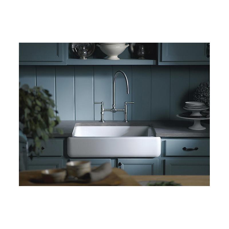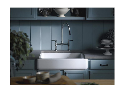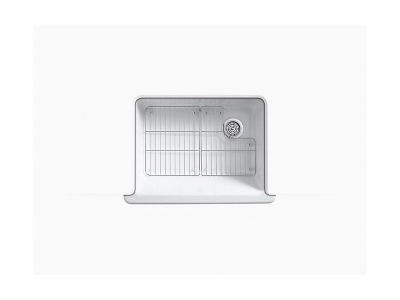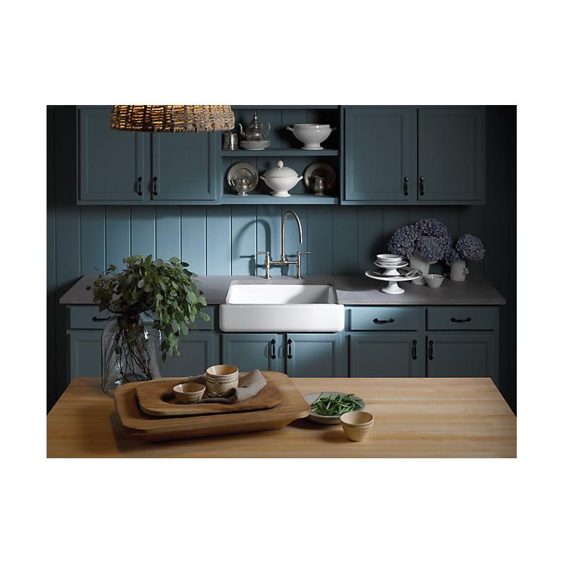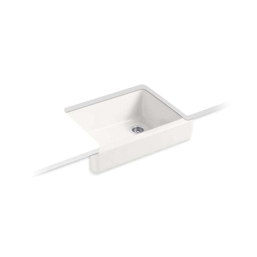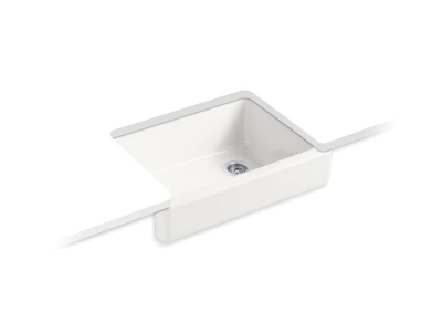 The KOHLER® Whitehaven apron-front kitchen sink features a streamlined and versatile farmhouse style. Perfect for remodeling projects, the Self-Trimming design requires only a rough cut to new or existing 30-inch standard cabinetry for simple installation and beautiful results. A large single basin accommodates large pots and pans, while the sloped bottom helps with draining and cleanup. Crafted from enameled cast iron, this sink resists chipping, cracking, or burning for years of beauty and reliable performance.