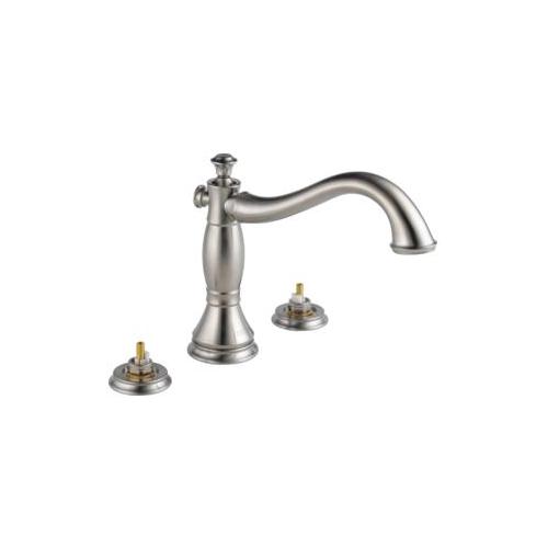 DELTA® Roman Tub Trim, Cassidy™, 2 gpm, 8 to 16 in Center Distance, Rigid Slip-On Spout, 10-3/32 in Spout Reach, 6-19/32 in Spout Height, 3 Faucet Holes, Function: Traditional, Hand Shower: No, 2-1/2 in Maximum Deck Thickness, Deck Mounting, Washerless Stem, 9-11/32 in H, Brass, Stainless Steel, Import