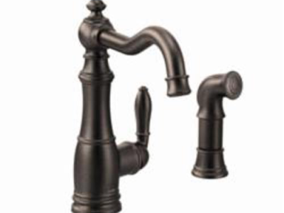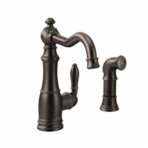 Moen® Kitchen Faucet, Weymouth™, 1.5 gpm, High-Arc Spout, 8-1/4 in Spout Reach, 10-1/2 in Spout Height, Lever, 1 Handle, Yes Side Spray(Y/N), 2 Faucet Holes, 1-1/2 in Faucet Hole, 3/8 in, Compression, Spray Pattern: Aerator Stream, 2-1/2 in Maximum Deck Thickness, Deck Mount, 1255 Duralast® Cartridge Valve/Cartridge, 3-1/2 in W x 9-1/4 in D x 10-1/2 in H, Metal, Oil Rubbed Bronze, Domestic, Commercial