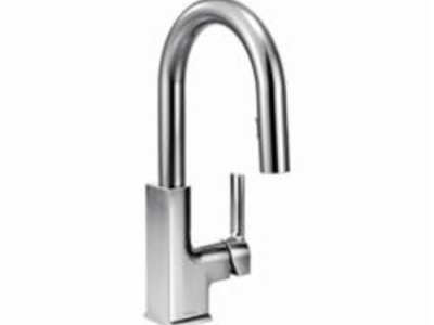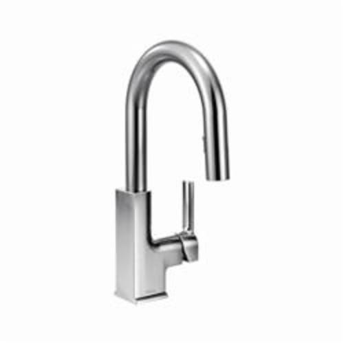 Moen® Bar Faucet, Pull-Down, STo™ Collection, 1.5 gpm Flow Rate, 7 in Spout Reach, 14.63 in Spout Height, 68 in L Hose, Lever Handle, 1 Handles, 1 Faucet Holes, 1-1/2 in Faucet Hole, 3/8 in Connection, Compression Connection, Spray Pattern: Aerated Stream, 2 Spray Functions, 2-1/2 in Maximum Deck Thickness, Deck Mounting, 1255™ Duralast™ Ceramic Disc Cartridge, 5.31 in W x 7 in D x 14.63 in H Dimensions, Metal, Polished Chrome, Domestic