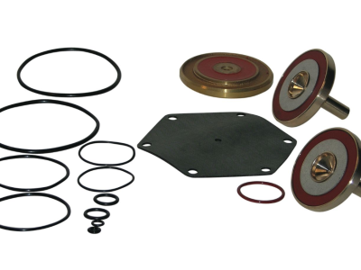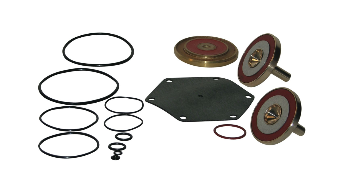 This total rubber parts kit is used for replacing or repairing the relief valve assembly on a lead free reduced pressure backflow assembly used to prevent the reverse flow of polluted water from entering into the potable water supply due to backsiphonage and or backpressure. This kit consists of a diaphragm, two molded disc assemblies, two seat O-rings, RV O-ring, two piston O-rings, RV stem O-ring, flow tube O-ring and cover O-ring.