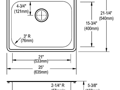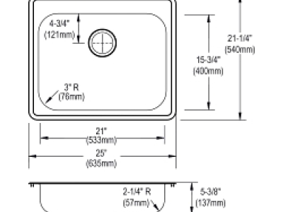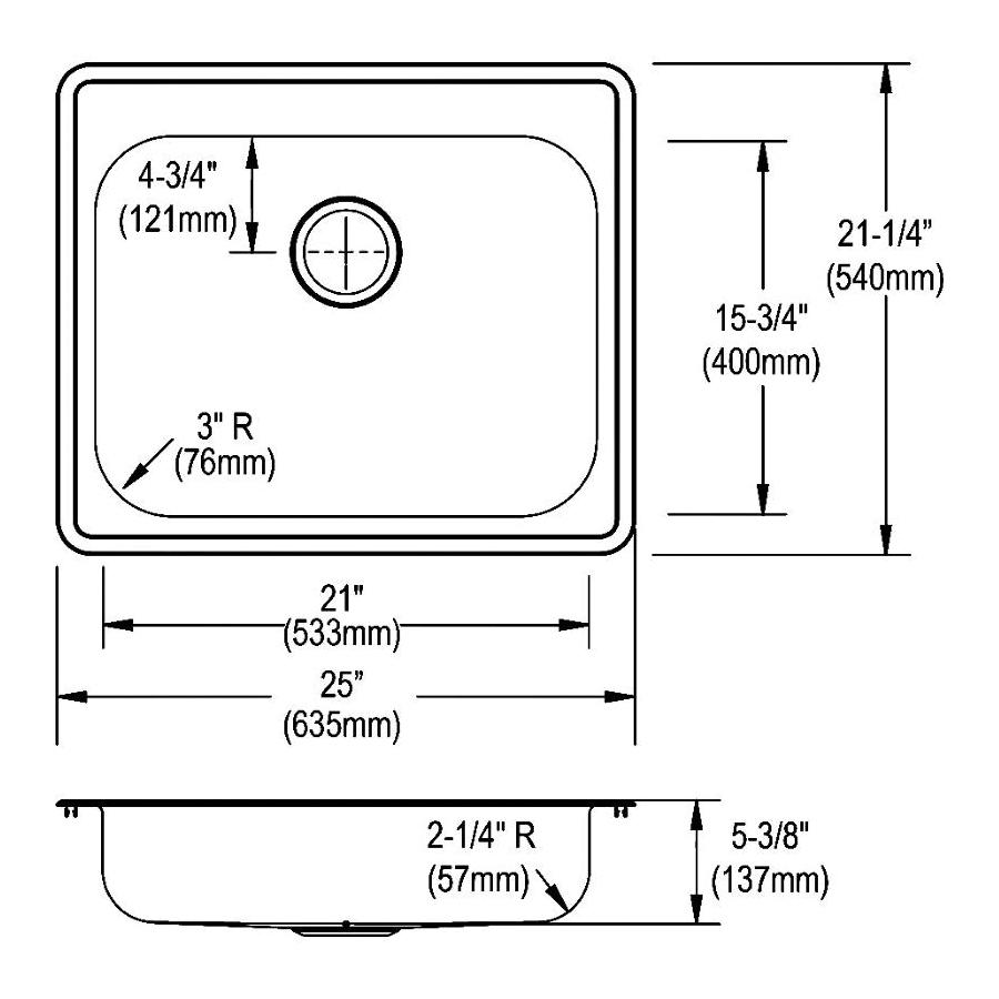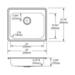 Elkay®, GE125213, Kitchen Sink, Dayton® Collection, Rectangle Shape, 21 in Bowl Length, 15-3/4 in Bowl Width, 5-1/4 in Bowl Depth, 3-1/2 in Drain Opening, 3 Faucet Holes, 4 in Faucet Hole Spacing, 1 Bowls, 25 in L x 21-1/4 in W x 5-3/8 in H Overall, Drop-In Mounting, Stainless Steel, Satin, Domestic