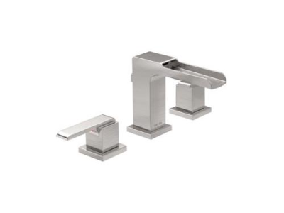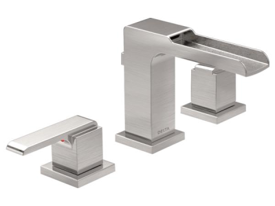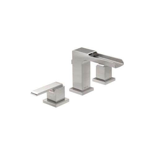DELTA® Widespread Lavatory Faucet, Ara® Collection, 1.5 gpm Flow Rate, 4 to 16 in Center Distance, Channel Spout, 6-1/8 in Spout Reach, 4-1/2 in Spout Height, 32 in L Hose, Lever Handle, 2 Handles, Pop-Up Drain, 3 Faucet Holes, 3/8 in Connection, Compression Connection, 2-1/4 in Maximum Deck Thickness, Deck Mounting, DIAMOND™ Seal Valve, 5-5/16 in H Dimensions, Brass, Stainless Steel, Domestic, Commercial Commercial/Residential