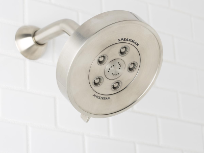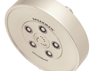 Speakman® Shower Head, Multi-Function, Neo™, 2.5 gpm Minimum Flow Rate, 1/2-14 FNPT, Round, Number of Sprays: 3, Spray Pattern: Massage/Full/Rain, Wall Mount, 5-1/2 in Head, 6 in Overall Length, 3-1/8 in Overall Height, Plastic, Brushed Nickel, Import