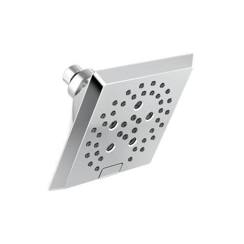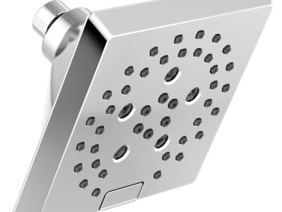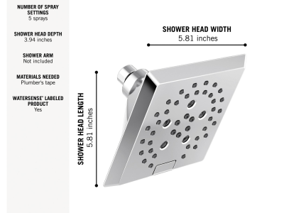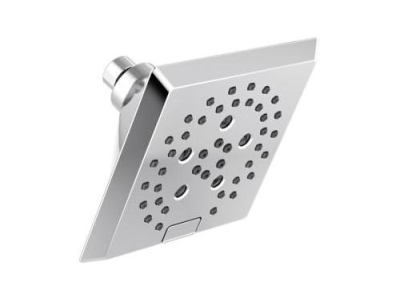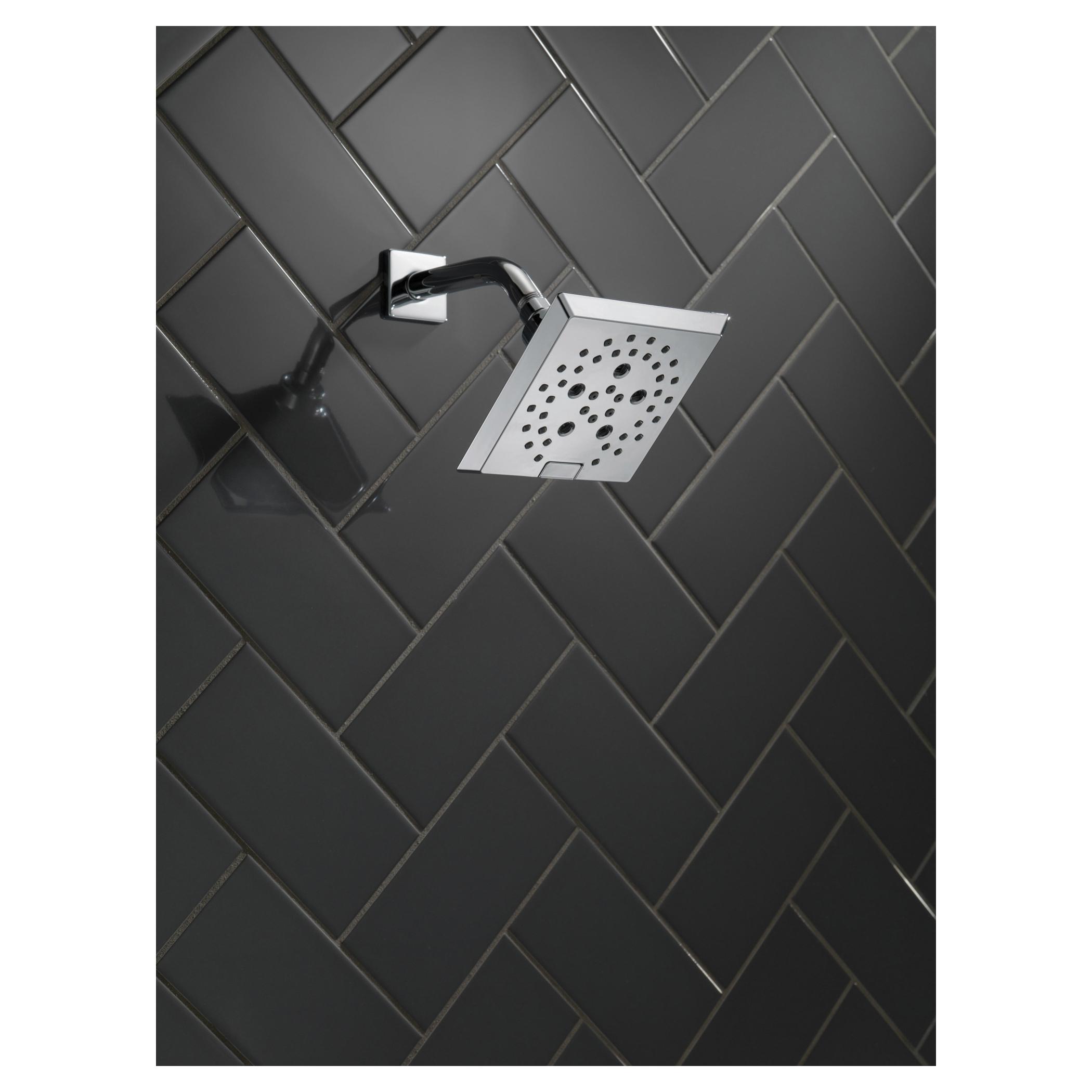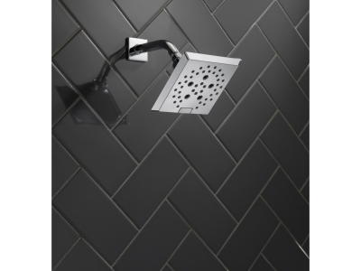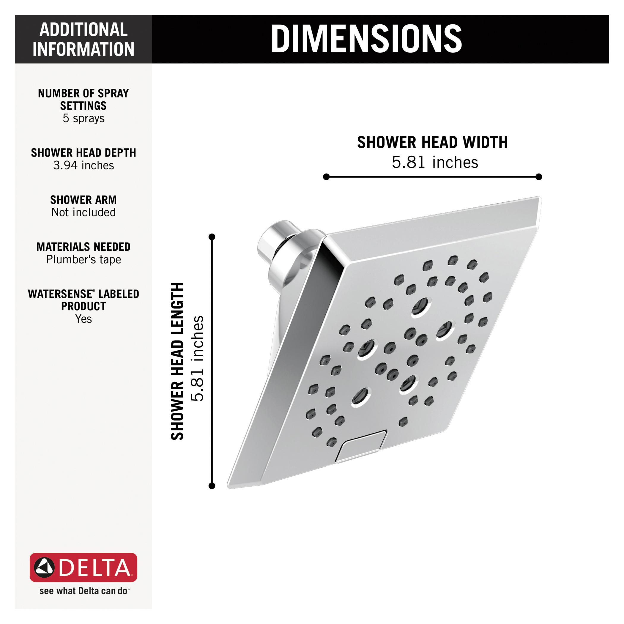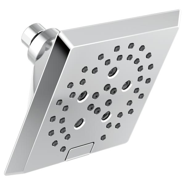 DELTA® Showerhead, Universal, 1.75 gpm Maximum, 1/2-14 NPT Connection, Square Shape, 5 Sprays, Spray Pattern: H2Okinetic® PowerDrench®/Full Body/Full with Massage/Massage/Pause, 80 psi Pressure, 5-13/16 in L x 5-13/16 in W x 3-15/16 in H Head, 3.94 in Overall Length, 5.81 in Overall Width, 5.81 in Overall Height, Plastic, Lumicoat™ Polished Chrome, Import