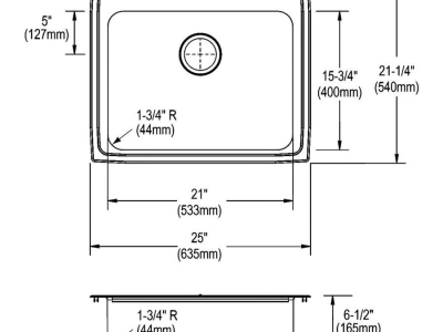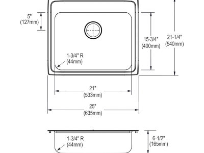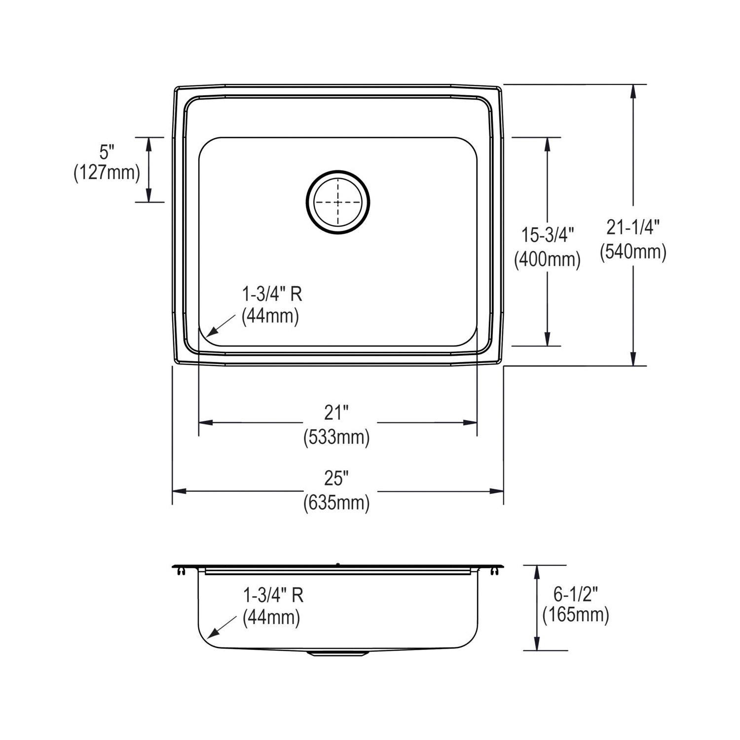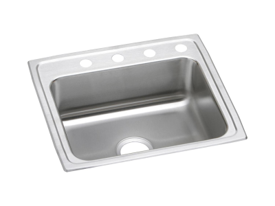 Elkay®, LRAD2521654, Kitchen Sink, Lustertone™ Classic Collection, Rectangle Shape, 21 in Bowl Length, 15-3/4 in Bowl Width, 6-3/8 in Bowl Depth, 3-1/2 in Drain Opening, 4 Faucet Holes, 4 in Faucet Hole Spacing, 1 Bowls, 25 in L x 21-1/4 in W x 6-1/2 in H Overall, Drop-In Mounting, Stainless Steel, Domestic