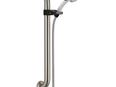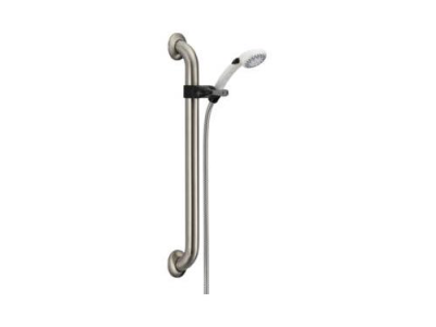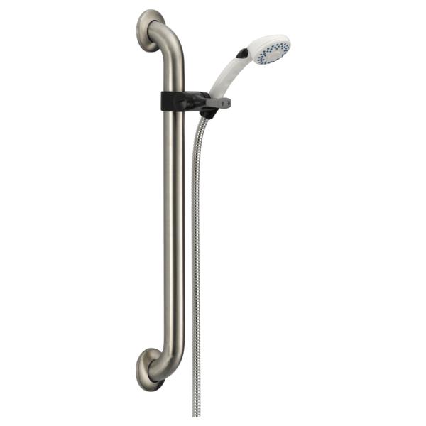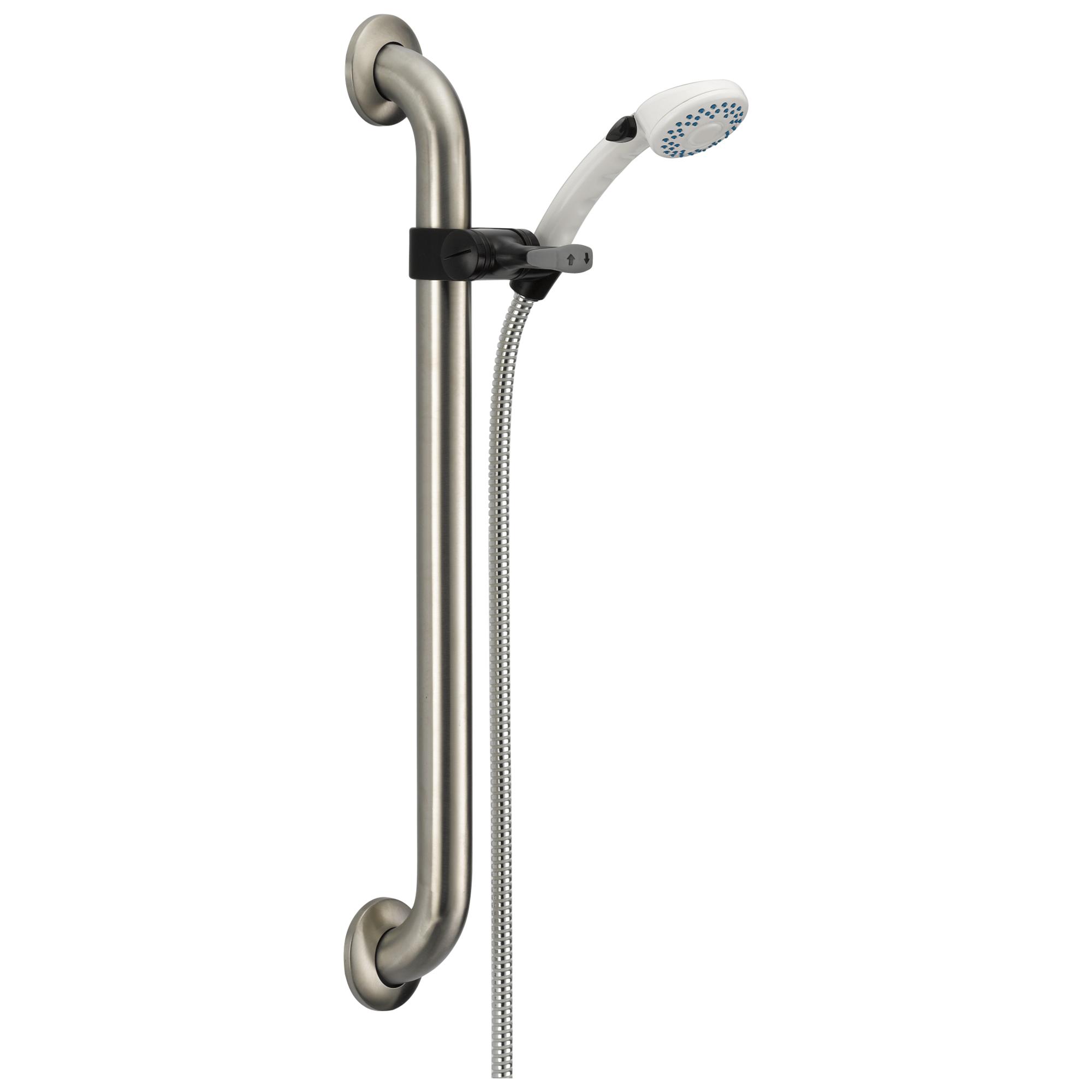DELTA® Hand Shower, 4 in Shower Head Dia, Shower Head Patterns: 2, 2.5 gpm, 60 in Hose Length, Full Body/Pause Spray, Slide Bar Holder, 80 psi, 1/2 in, Metal, Stainless Steel, With Slide Bar Yes/No: Yes, Import