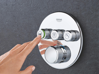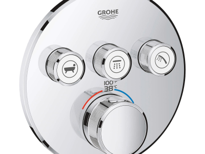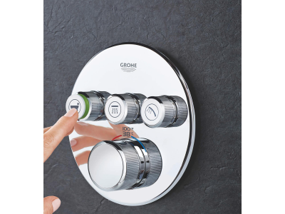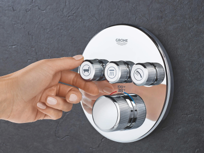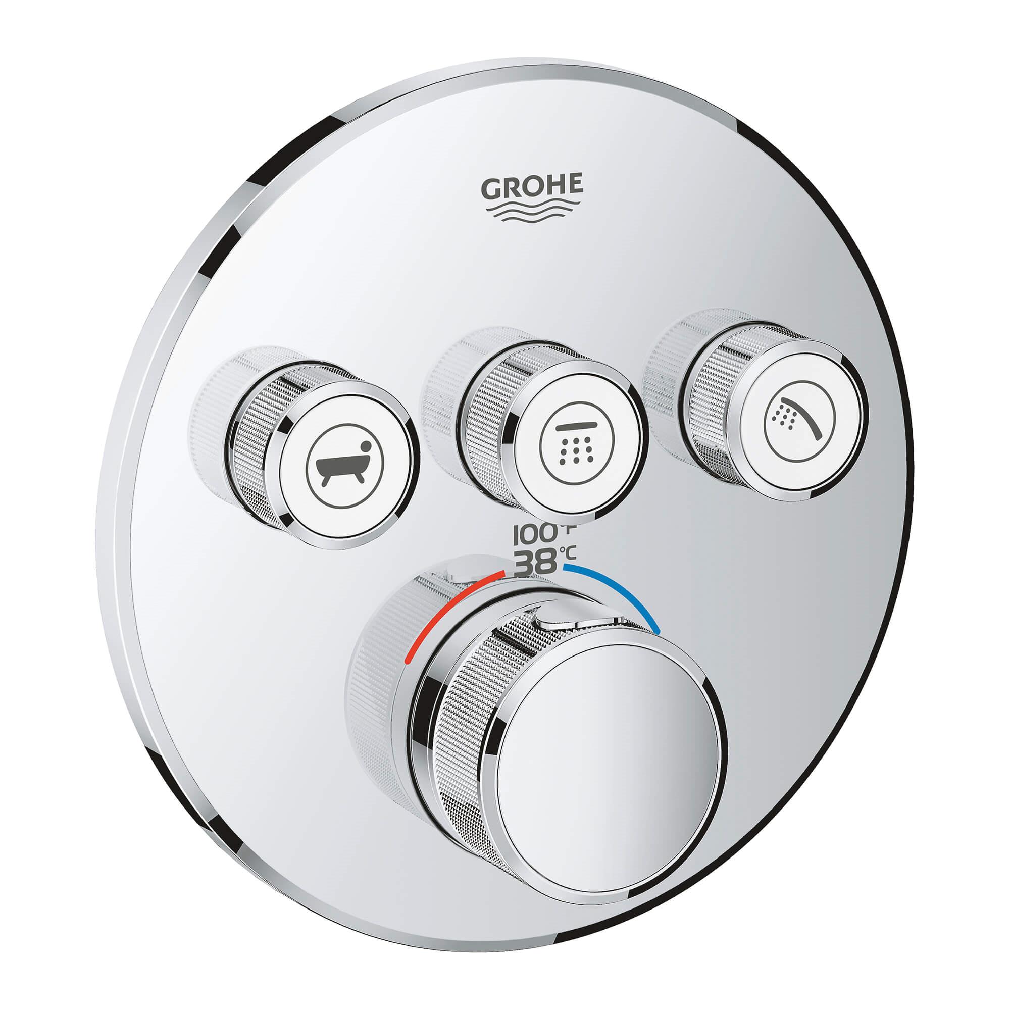 Choose a thermostat that is as flexible as possible for your most enjoyable shower or bath ever. Packed with useful features, the Grohtherm SmartControl concealed thermostat features a minimalist design that will enhance any modern bathroom. The innovative SmartControl technology allows you to select your desired spray source and adjust the water volume at the push-turn of a button. The three valves offer total flexibility, whatever your shower set up - you can control, switch between or even combine different spray patterns and water outlets - perfect for spaces where you want to have hand, head and side showers, as well as a bath. Integrated GROHE TurboStat technology prevents any unpleasant temperature fluctuations. GROHE EasyLogic markings and textured buttons with exchangeable symbols make it easy and intuitive to use. Family-friendly, the GROHE SafeStop override button allows you to set a maximum temperature of 100 deg F/38 deg C to prevent scalding. Water-saving GROHE EcoJoy technology gives you the option of a reduced flow rate with no compromise on enjoyment. Thanks to the GROHE QuickFix® system it's swift and straightforward to install. The slim profile makes it easy to keep clean and the durable StarLight® Chrome finish will look pristine for years to come. With a slim, round design perfect for that minimalist, streamlined look, this product is bound to enhance your bathroom scheme. Please note that this product must be installed in combination with the GROHE Rapido® SmartBox (35601000).