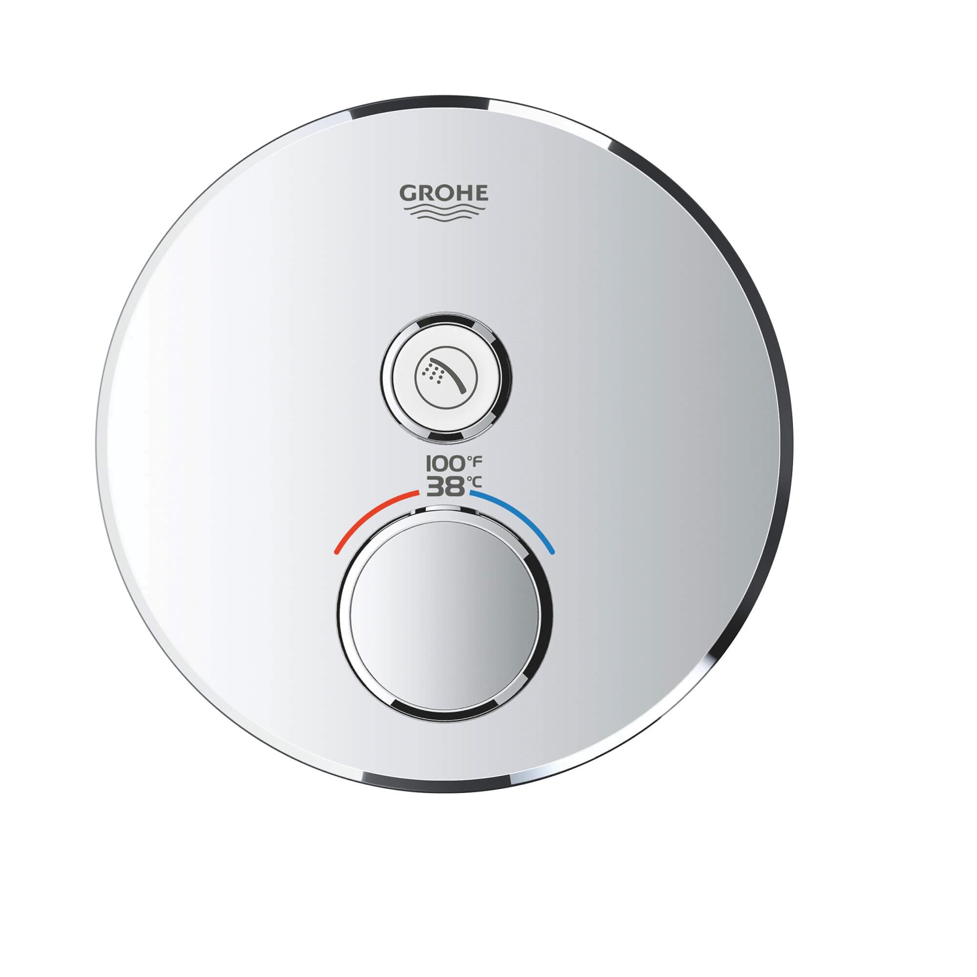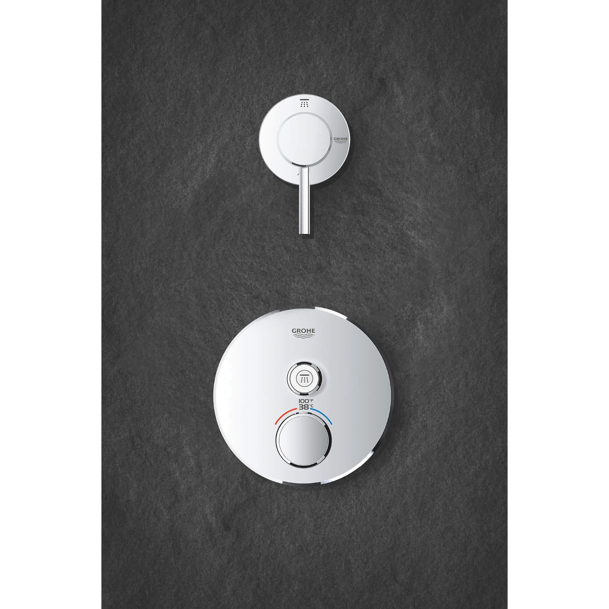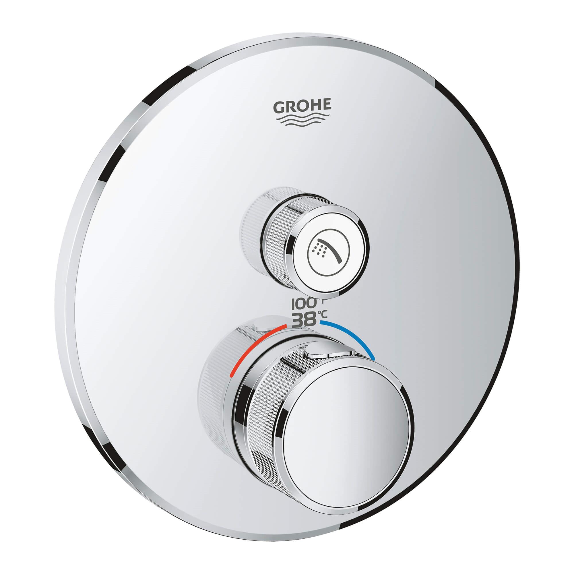 Choose a thermostat that is as flexible as possible for your most enjoyable shower or bath ever. Packed with useful features, the Grohtherm SmartControl concealed thermostat features a minimalist design that will enhance any modern bathroom. The innovative SmartControl technology allows you to select your desired spray source and adjust the water volume at the push-turn of a button. The three valves offer total flexibility, whatever your shower set up - you can control, switch between or even combine different spray patterns and water outlets - perfect for spaces where you want to have hand, head and side showers, as well as a bath. Integrated GROHE TurboStat technology prevents any unpleasant temperature fluctuations. GROHE EasyLogic markings and textured buttons with exchangeable symbols make it easy and intuitive to use. Family-friendly, the GROHE SafeStop override button allows you to set a maximum temperature of 100 deg F/38 deg C to prevent scalding. Water-saving GROHE EcoJoy technology gives you the option of a reduced flow rate with no compromise on enjoyment. Thanks to the GROHE QuickFix® system it's swift and straightforward to install. The slim profile makes it easy to keep clean and the durable StarLight® Chrome finish will look pristine for years to come. With a slim, round design perfect for that minimalist, streamlined look, this product is bound to enhance your bathroom scheme. Please note that this product must be installed in combination with the GROHE Rapido® SmartBox (35601000).