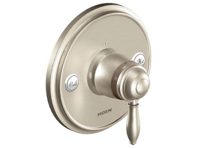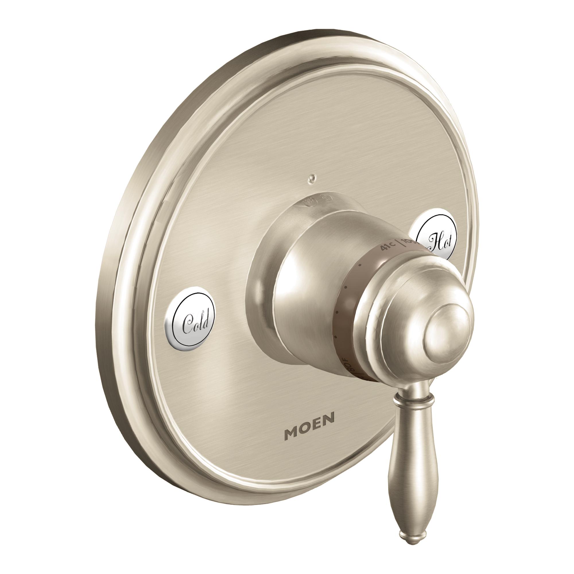 Elegant, traditional design details and distinctive finishing touches present a sense of uncommon luxury in the Weymouth collection. Distinctive accents include porcelain inlays that feature Euro influenced decorative script and signature styling elements. This brushed nickel ExactTemp tub/shower valve only was built to last by MOEN. Designed for use in your bath. This trim kit requires MOEN valve S3371 to complete installation.