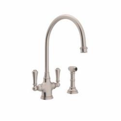 Rohl® Kitchen Mixer, Perrin & Rowe® Collection, 1.8 gpm Flow Rate, C Spout, 9 in Spout Reach, 8-1/4 in Spout Height, Lever Handle, 2 Handles, Side Spray(Y/N): Yes, 1 Faucet Holes, 1-3/8 in Faucet Hole, 1-3/4 in Maximum Deck Thickness, Deck Mounting, Ceramic Quarter Turn, 14-9/16 in H Dimensions, Solid Brass, Satin Nickel