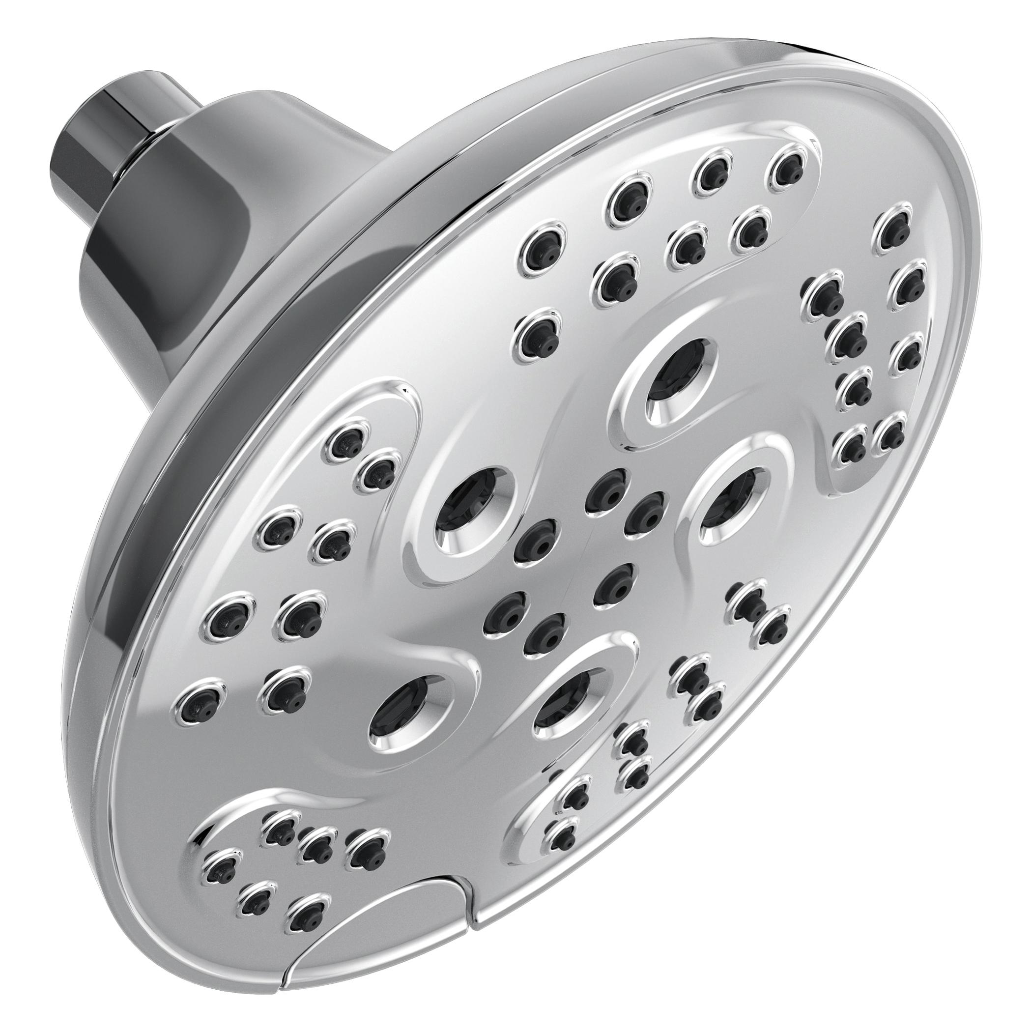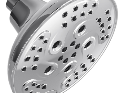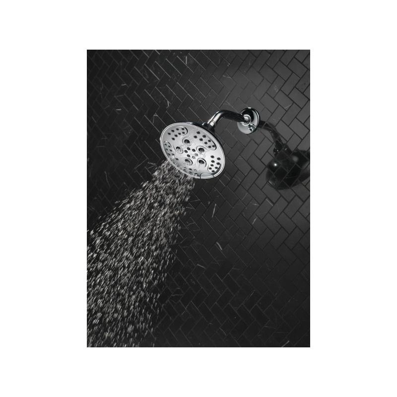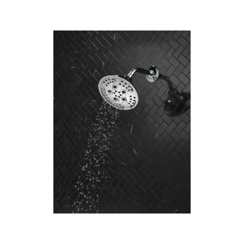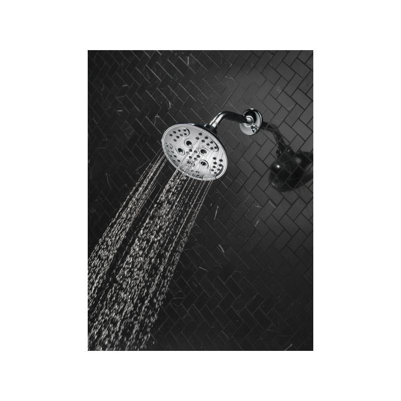 DELTA® Raincan Shower Head, Universal Transitional, 1.75 gpm Maximum, 1/2-14 NPT Connection, Round Shape, 5 Sprays, Spray Pattern: Pause/Massage/Full Body with Massage/H2Okinetic®, 80 psi Pressure, 6 in Dia x 4 in H Head, ABS, Polished Chrome, Import