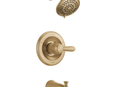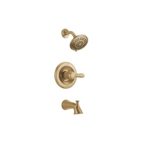 DELTA® Tub and Shower Trim, Series: Monitor® 14, Lahara® Collection, 1.75 gpm Shower Flow Rate, Pull-Up Diverter Spout, 5-1/2 in Spout Reach, 1 Handles, Metal Lever Handle, 7 in Dia Trim, 1222 Pressure Balanced, Hand Shower: No, Spray Pattern: Full Body/Full Body with Massage/Fast Massage/Pause/Soft Drench, 1 Spray Functions, 80 psi Pressure, Wall Mounting, For Use With: MultiChoice® R10000 Series Universal Rough-In Valve Body, Solid Brass, Brilliance® Champagne Bronze