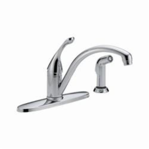 DELTA® Kitchen Faucet, Collins™ Collection, 1.5 gpm Flow Rate, 8 in Center Distance, Swivel Spout, 9-3/16 in Spout Reach, 5-1/8 in Spout Height, 45 in Hose, Lever Handle, 1 Handles, Side Spray(Y/N): Yes, 4 Faucet Holes, 1-15/16 to 1-1/2 in Faucet Hole, 3/8 in Connection, Compression Connection, Spray Pattern: Full Body, 1 Spray Functions, 2-1/2 in Maximum Deck Thickness, Deck Mounting, Euro-Motion DIAMOND™ Seal Valve, Brass, Polished Chrome, Domestic