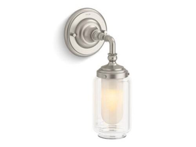 Kohler® Artifacts™ Sconce, Dimmable Gooseneck, Series: 72584, 120 V, CFL Lighting Technology, 40 W Lamp, E26 Medium Lamp Base, 1 Lamp, Clear Light, Clear Frosted Glass Shade, Wall Mounting, Brass/Zinc Housing Material, Brushed Nickel Housing Finish, 5-1/2 in Dia x 7-1/2 in W x 13-3/16 in H Dimensions