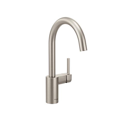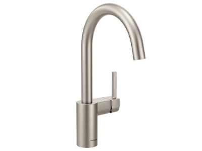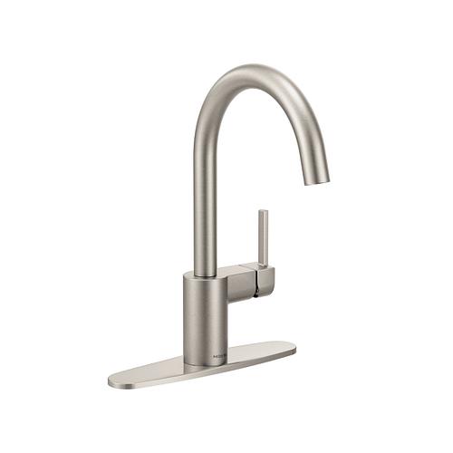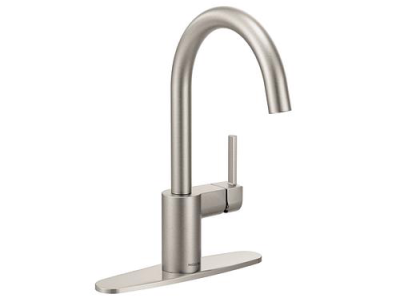 The Moen Align One-Handle Kitchen Faucet creates a sleek and streamlined focal point while providing convenient features to make everyday cleaning and prep work easier. This kitchen faucet features a high-arc spout that provides a generous clearance for taller pots and pans. To make cleaning tasks easier and more efficient, the faucet produces an aerated stream.This faucet easily mounts on a sink or countertop thanks to the Duralock Quick Connect system, and has a Spot Resist Stainless finish that resists fingerprints and water spots. It features a Duralast 1255 cartridge to deliver durable performance year after year and is backed by Moen's Limited Lifetime Warranty.