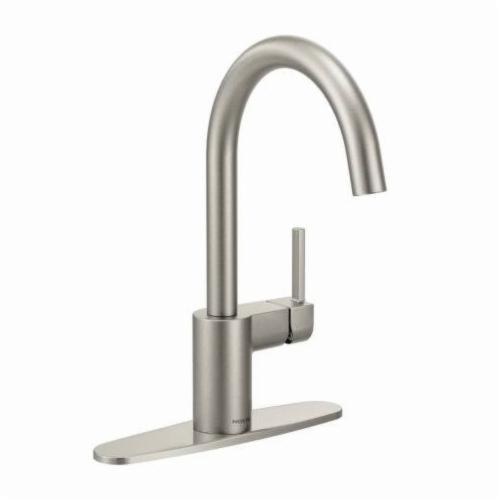 Moen®, 7365SRS, Kitchen Faucet, Align™ Collection, 1.5 gpm Flow Rate, High-Arc Spout, 8 in Spout Reach, 15.31 in Spout Height, Lever Handle, 1 Handles, Side Spray(Y/N): No, 1/3 Faucet Holes, 1-1/2 in Faucet Hole, 3/8 in Connection, Compression Connection, Spray Pattern: Aerated Stream, 2-1/2 in Maximum Deck Thickness, Deck Mounting, 1255 Duralast™, 12.25 in W x 9.06 in D x 15.31 in H Dimensions, Metal, Spot Resist Stainless, Import
