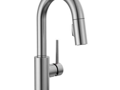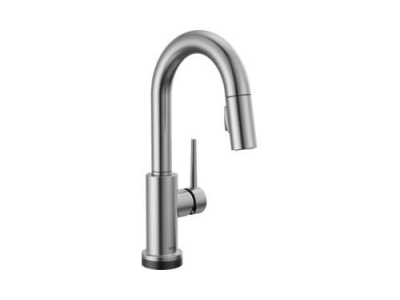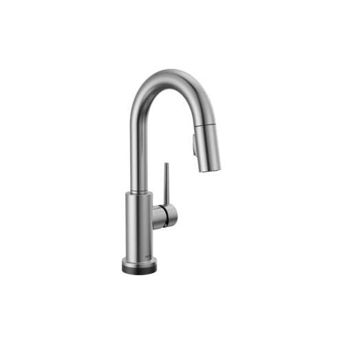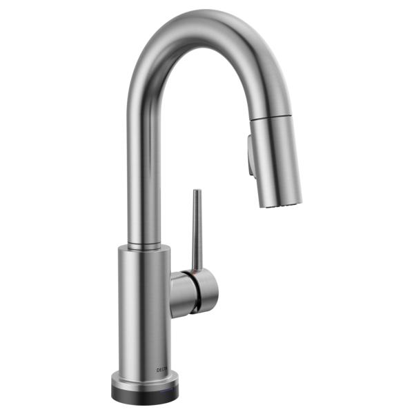 DELTA® Bar/Prep Faucet, Pull-Down, Series: Touch2O®, Trinsic® Collection, 1.8 gpm Flow Rate, 8 in Center Distance, High-Arc Spout, 6-1/2 in Spout Reach, 13 in Spout Height, 1 Handles, 1 Faucet Holes, 1-1/4 to 1-1/2 in Faucet Hole, 3/8 in Connection, Compression Connection, 2-1/2 in Maximum Deck Thickness, Deck Mounting, DIAMOND™ Seal Valve/Electronic, Zinc, Arctic™ Stainless Steel, Domestic