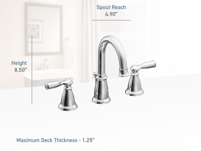 Moen®, WS84924BRB, Bathroom Faucet, Widespread, Series: WS84924, Banbury® Collection, 1.2 gpm Flow Rate, 8 to 16 in Center Distance, 5.02 in Spout Reach, 4-7/8 in Spout Height, Lever Handle, 2 Handles, 3 Faucet Holes, 1/2 in Connection, IPS Connection, 1-1/4 in Maximum Deck Thickness, 1234 Cartridge, 8-1/2 in H Dimensions, Metal, Mediterranean Bronze, Commercial Commercial/Residential