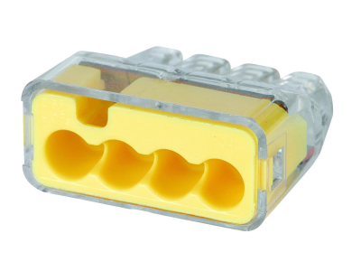 IDEAL® In-Sure™ Push-In Wire Connector, Solid/Stranded/Tin-Bonded Wire, 20 to 12 AWG, 18 to 12 AWG, 18 to 14 AWG Wire, 600 V AC, Specifications: 4 Ports, 3/8 to 1/2 in Strip Length, 221 deg F, Nylon/Polycarbonate, Yellow, Tin Plated, 0.78 in L x 0.82 in W x 0.38 in H Dimensions