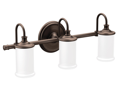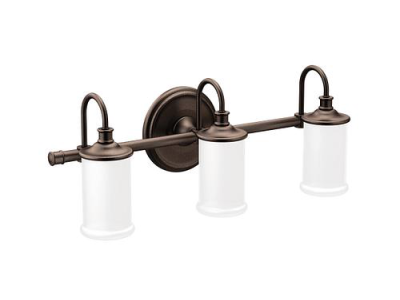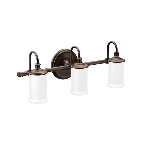 Moen®, YB6463ORB, Bath Light, 110 V AC, 100 W Lamp, Medium Lamp Base, 3 Lamps, Bell Shade, Glass/Steel Housing Material, Oil Rubbed Bronze Housing Finish, 23.3 in W x 8.625 in D x 7.1 in H Dimensions
