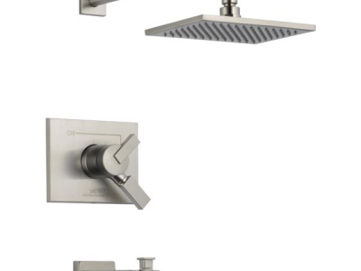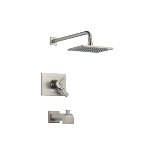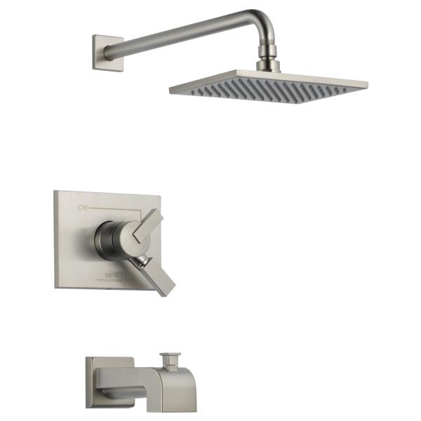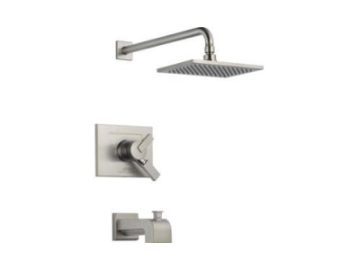 DELTA® Tub and Shower Trim, Series: Monitor® 17, Vero® Collection, 2.5 gpm Shower Flow Rate, Pull-Up Diverter Spout, 6-1/2 in Spout Reach, 2 Handles, Metal Lever Handle, 7-3/32 in L x 5-19/32 in H Trim, 1222 Pressure Balanced, Hand Shower: No, Spray Pattern: Full Body, 1 Spray Functions, Wall Mounting, For Use With: For use with MultiChoice® Universal Rough-In Valve Body(R10000 Series), Plastic, Brilliance® Stainless Steel, Domestic