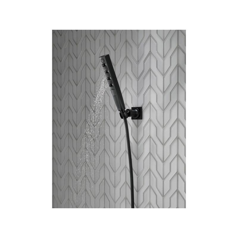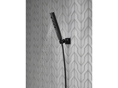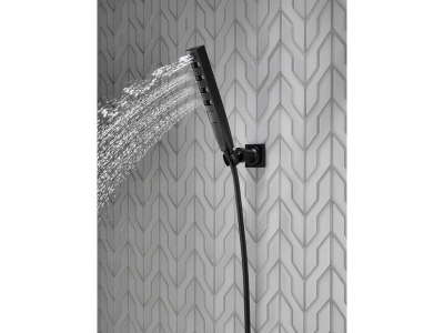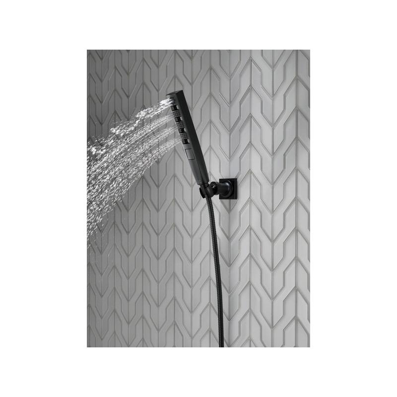 Experience a better shower with the control and flexibility of a Delta® hand shower. Great for showering yourself or your loved ones and pets, as well as for keeping your shower and tub clean. Delta® H2Okinetic® Showers look different because they are different. Using advanced technology, H2Okinetic showers sculpt water into a unique wave pattern, giving you 3X the coverage of a standard shower head.* The end result is a shower that provides more coverage, more warmth and more intensity for a truly drenching shower experience. So go ahead and indulge, because now you can enjoy the feeling of more water without using more water. The Matte Black finish makes a statement in your space, cultivating a sophisticated air and coordinating flawlessly with most other fixtures and accents. With bright tones, Matte Black is undeniably modern with a strong contrast, but it can complement traditional or transitional spaces just as well when paired against warm neutrals for a rustic feel akin to cast iron. While other products may gather unsightly mineral build-up over time, Delta soft rubber Touch-Clean® spray holes allow any mineral residue to simply be wiped away for an instantly refreshed look – with no need for soaking or the aid of chemical cleaners. The pause setting gives you ample space for shaving, lathering and other shower tasks, then easily restarts the water with the temperature where you left off. This spray setting helps you conserve water, so you can worry less about depleting your supply of hot water - and you help the environment too.