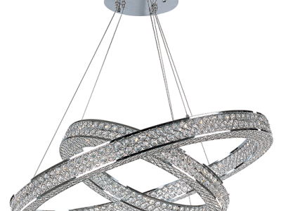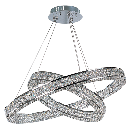 Frames of metal rings encased with Beveled Crystal Jewels, are finished in Polished Chrome. Suspended by cables as if floating In air, these rings cast rainbows of light when illuminated by the Integrated LED.
