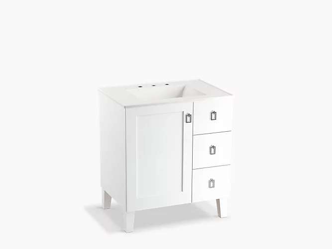 Kohler K-99530-LGR-1WA Poplin(R) 30" Bathroom Vanity Cabinet with Legs, 1 Door and 3 Drawers on Right - White