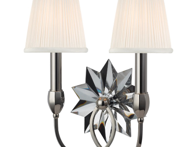 The multi-point star motif is an American legacy. Colonial sconce makers amplified the candle's firelight glow by fitting a concave backplate with a starburst array of mirrored glass panes. Picking up on this tradition, we cut Barton's twenty wedged facets from a solid crystal block. Set against a plated nickel backdrop, Barton's silvery crystal star reflects the warm light its pleated silk shade pours out toward it.