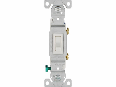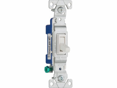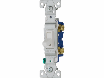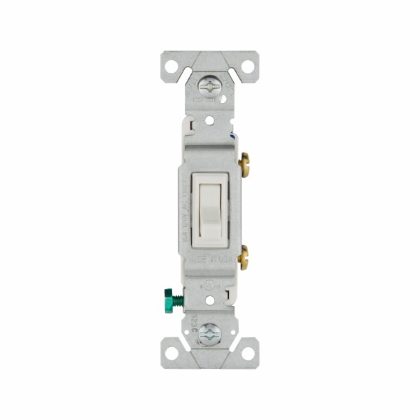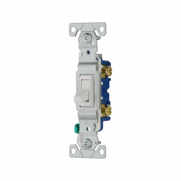 Eaton toggle switch, #14-10 AWG, 15A, Residential, Flush, 120V, Side and push, Screw, White, Load type: Motor Control, Fan, LED, Incandescent, ELV, MLV, CFL, Flourescent, Halogen, Single-Pole, Polycarbonate