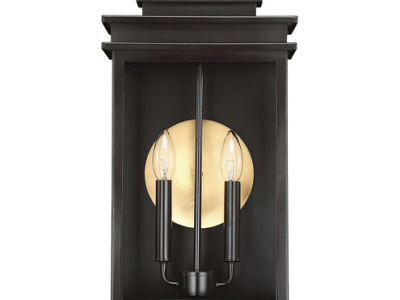 Brighten the exterior of your home with a traditional Craftsman style lantern. The Reading is designed by Karyl Pierce Paxton and has all the classic stylings of the Arts & Crafts era. A rectangular box frame features multiple, tiered, horizontal elements at the bottom and the roof of the lantern, and has an open rectangle top finial. This elegant lantern boasts a rich, dark English bronze finish - plus a dramatic circular accent of bright, warm brass. The brass circle adds a delightful touch to the appearance and beautifully reflects light from two 60W, C-style bulbs. It's 10" wide, 20" high, and UL listed for wet locations: a stylish choice for welcoming illumination on your porch, patio, pergola, sunroom, or other walls of your outdoor living areas.
