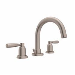 Rohl® Widespread Lavatory Faucet, Perrin & Rowe® Bath Holborn, 1.2 gpm, 8 in Center Distance, Tubular C-Spout Spout, 6 in Spout Reach, 3-1/4 in Spout Height, Lever Handle, 2 Handles, Pop-Up Drain, 3 Faucet Holes, 1/2 in Connection, NPSM Connection, 1-1/2 in Maximum Deck Thickness, Deck Mounting, Ceramic Disc, 7-1/2 in H, Brass, Satin Nickel