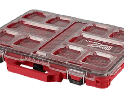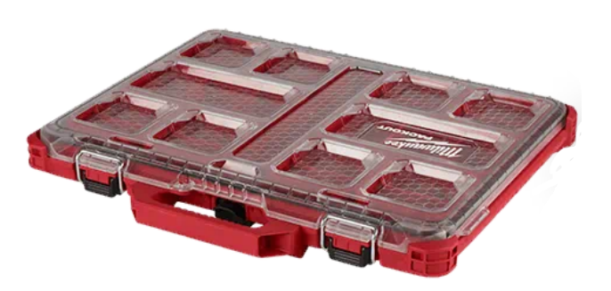 The PACKOUT low profile organizer is constructed with impact resistant materials so it can withstand harsh jobsite environments. An IP-65 rated weather seal protects your tools, accessories, and small parts from rain and other jobsite debris. The shallow organizer's interior features 10 removable storage bins with removable dividers. The transparent lid of the organizer seals the bins to prevent contents from migrating and shifting during transport. Heavy duty latches and reinforced hinges ensure that the slim organizer keeps the contents contained and protected.