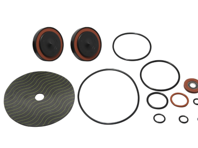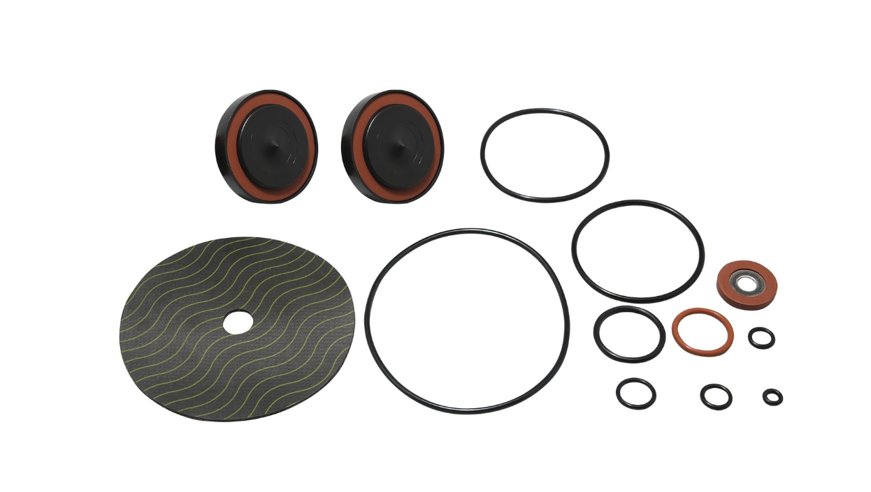This reduced pressure backflow total rubber parts kit consists of two check assembly o-rings, two disc assemblies, one cover o-ring, one relief valve diaphragm, relief valve seat o-ring, one sensing passage o-ring, one diaphragm plate o-ring, one relief upper and one lower stem o-ring, one relief valve disc assembly and one bleed screw o-ring.