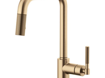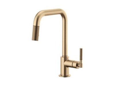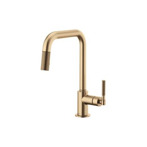 Brizo® Kitchen Faucet, Pull-Down, Litze™ Collection, 1.8 gpm Flow Rate, Square Spout, 9 in Spout Reach, 14 in Spout Height, Knurled Lever Handle, 1 Handles, 1 Faucet Holes, 1-1/4 to 1-1/2 in Faucet Hole, 3/8 in Connection, Compression Connection, Spray Pattern: Stream, Function: Traditional, 2 Spray Functions, 3 in Maximum Deck Thickness, Deck Mounting, Euro-Motion Ceramic Disc Cartridge, Brass, Luxe Gold
