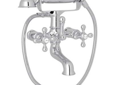 - Floor mount exposed two handle tub filler with cradle and single-function handshower