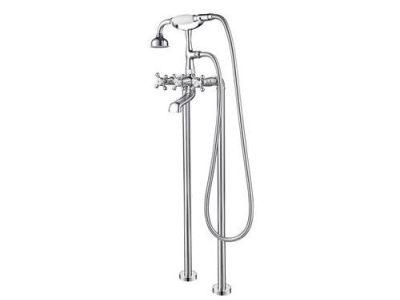 Barclay Freestanding Tub Filler, Series: 4607-MC, 6.9 gpm, 6 in Center Distance, Elephant Spout, 6-5/8 in Spout Reach, 29-1/8 in Spout Height, 59 in Hose, Metal Cross with Porcelain Buttons, 3 Handles, 2 Faucet Holes, 1/2 in, Male, Hand Shower Yes/No: Yes, 1/4 Turn Ceramic Disc Valve/Cartridge, 8-1/2 in W x 6-5/8 in D x 41-1/8 in H, Brass, Polished Chrome, Import
