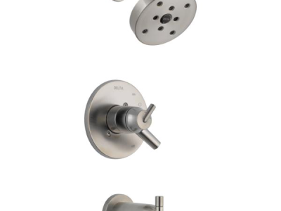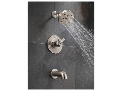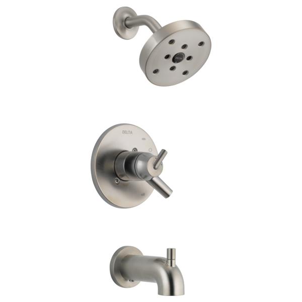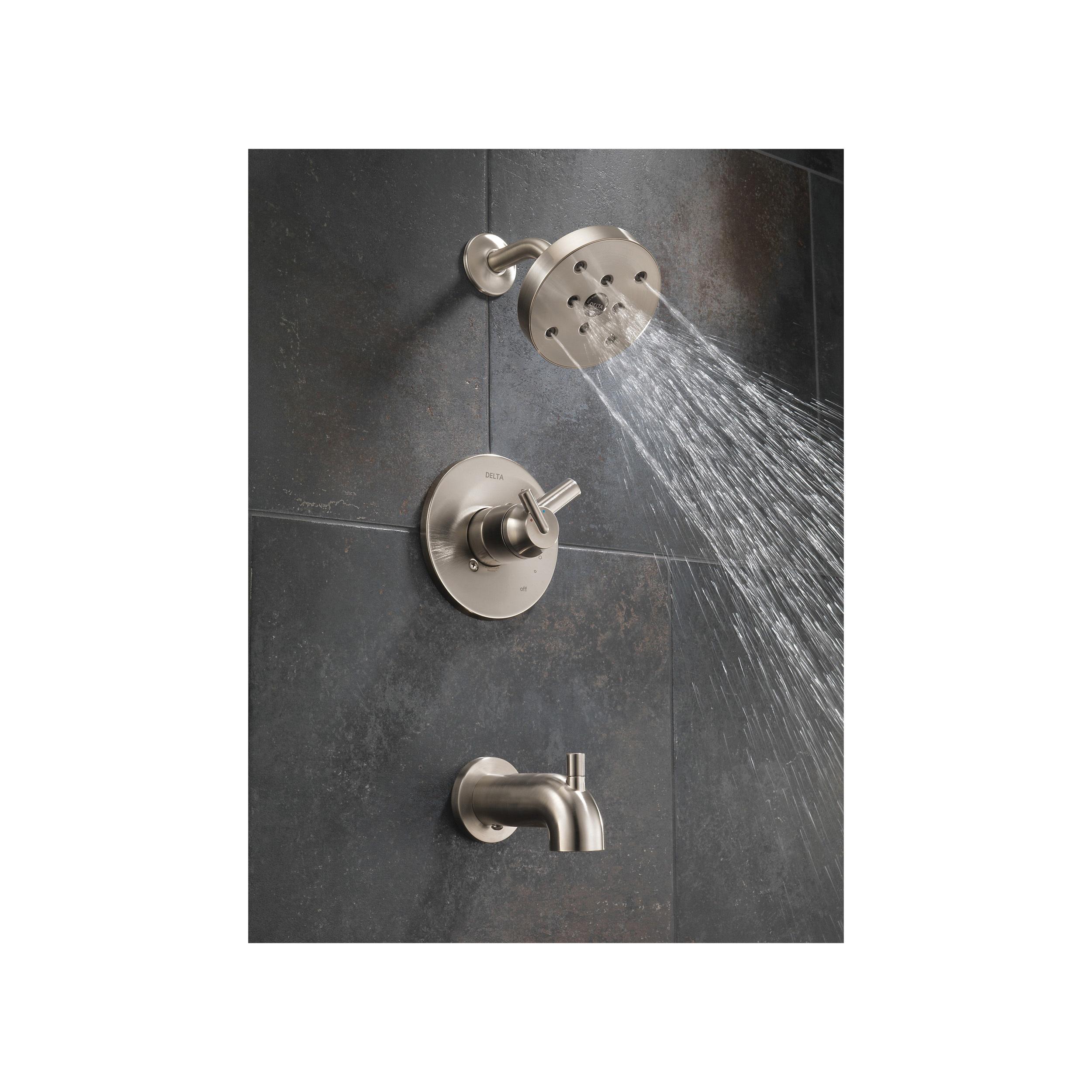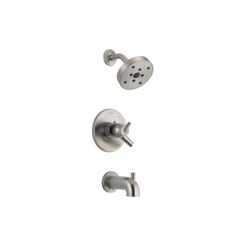 DELTA® Tub and Shower Trim, Series: Monitor® 17, Trinsic® Collection, 1.75 gpm Shower Flow Rate, Pull-Up Diverter Spout, 5-1/4 in Spout Reach, 1 Handles, Lever Handle, 6-1/2 in Dia Trim, 1222 Pressure Balanced, Hand Shower: No, Spray Pattern: H2Okinetic®, 1 Spray Functions, Wall Mounting, For Use With: For use with MultiChoice® Universal Rough-In Valve Body(R10000 Series), Solid Brass, Stainless Steel