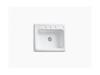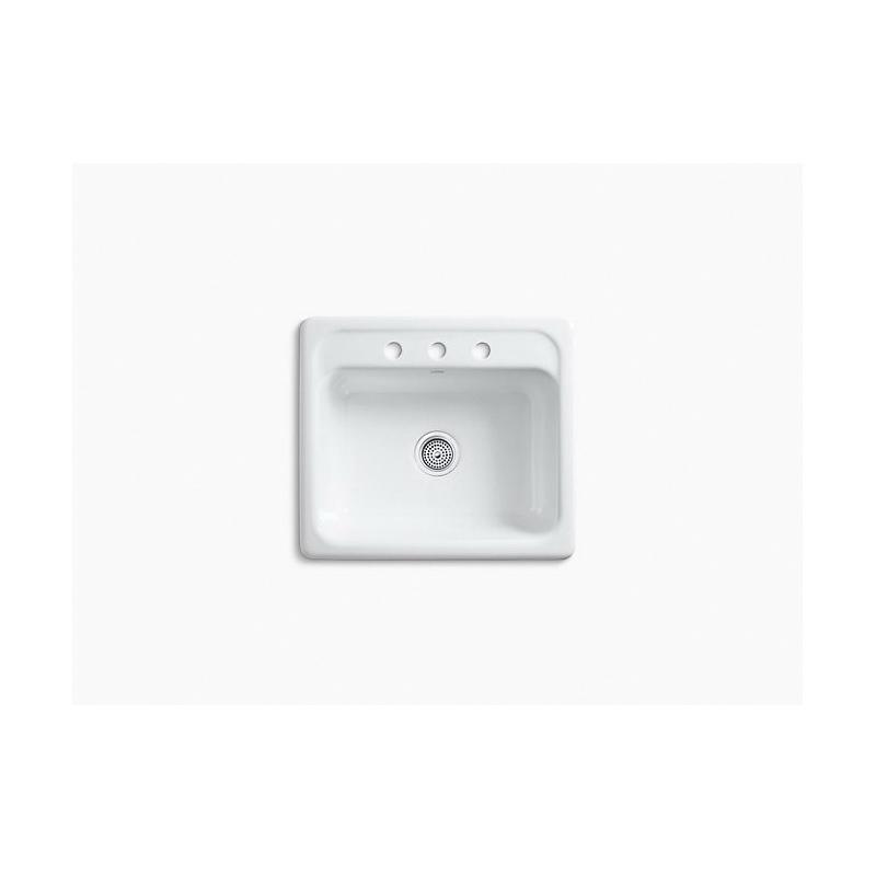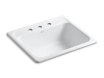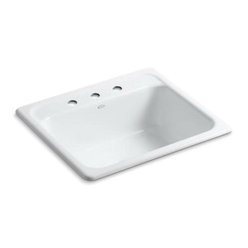 Kohler®, 5964-3-0, Kitchen Sink, Mayfield™ Collection, Rectangular Shape, 22 in Bowl Length, 15 in Bowl Width, 7-3/4 in Bowl Depth, 3-5/8 in Drain Opening, 3 Faucet Holes, 4 in Faucet Hole Spacing, 1 Bowls, 25 in L x 22 in W x 8-3/4 in H Overall, Top Mounting, Enameled Cast Iron, White