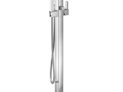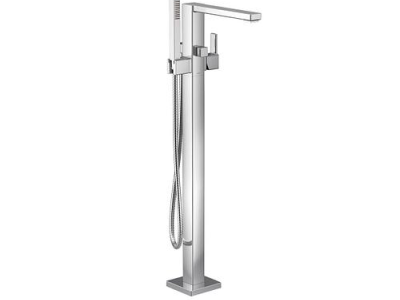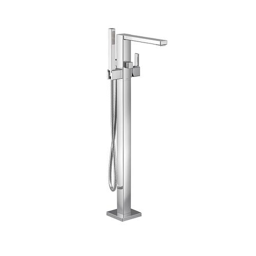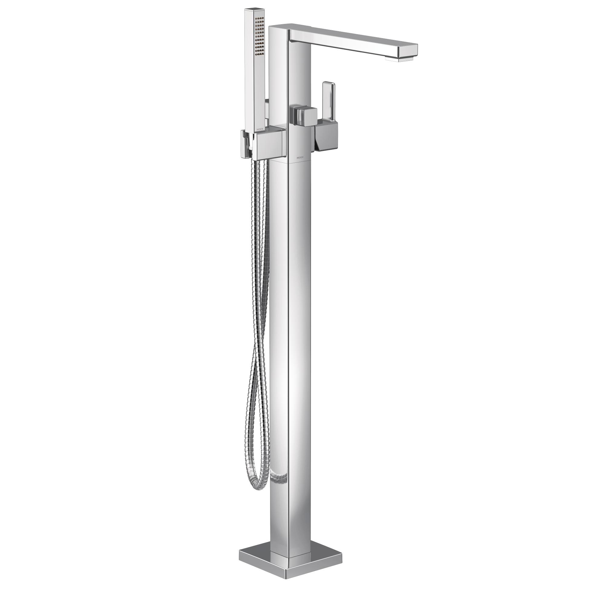 Moen®, S905, Tub Filler Faucet, Premium Floor Mount, 90 Degree™ Collection, 11 in Spout Reach, 34-1/2 to 37-1/2 in Spout Height, 59 in L Hose, Lever Handle, 1 Handles, 1 Faucet Holes, 1/2 in Connection, CC/NPT Connection, 1 Spray Functions, Hand Shower: Yes, Integral Dual Check Valve, 35-1/2 to 38-1/2 in H Dimensions, Metal, Chrome, Domestic, Commercial Commercial/Residential