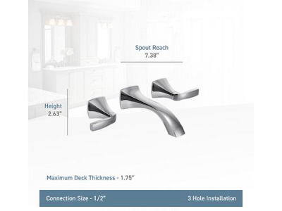 Moen®, T6906BN, Bathroom Faucet, Series: T6906, Voss™ Collection, 1.5 gpm Flow Rate, 8 in Center Distance, Fixed Spout, 7-3/8 in Spout Height, Lever Handle, 2 Handles, 3 Faucet Holes, 1/2 in Connection, C Connection, Function: Traditional, Wall Mounting, 1224 Ceramic Disc Cartridge, 9.25 in W x 7.38 in D x 2.63 in H Dimensions, Metal, Brushed Nickel, Domestic