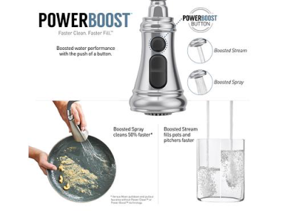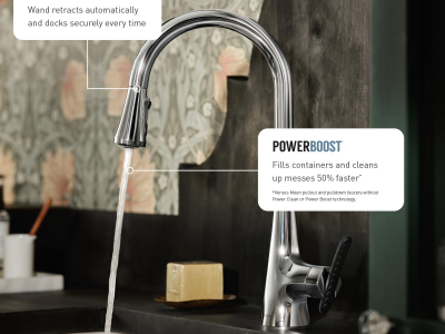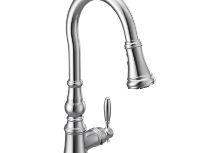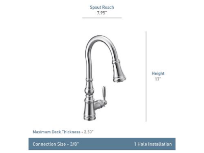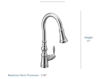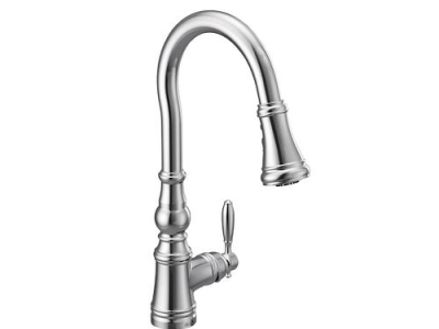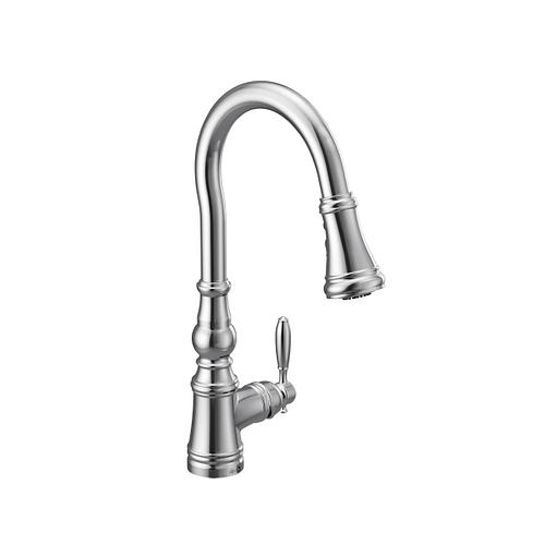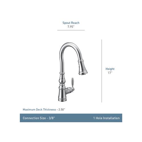 Moen®, S73004, Kitchen Faucet, Series: S73004, Weymouth™ Collection, 1.5 gpm Flow Rate, High-Arc Spout, 7-61/64 in Spout Reach, 9-3/16 in Spout Height, 68 in Hose, Lever Handle, 1 Handles, 1 Faucet Holes, 1-1/2 in Faucet Hole, 3/8 in Connection, Compression Connection, Spray Pattern: Boosted Rinse, Powerful Cleaning Rinse, Aerated Stream, Boosted Stream, 4 Spray Functions, 2-1/2 in Maximum Deck Thickness, Deck Mounting, 1255 Duralast™, 16-47/64 in H Dimensions, Metal, Chrome, Domestic